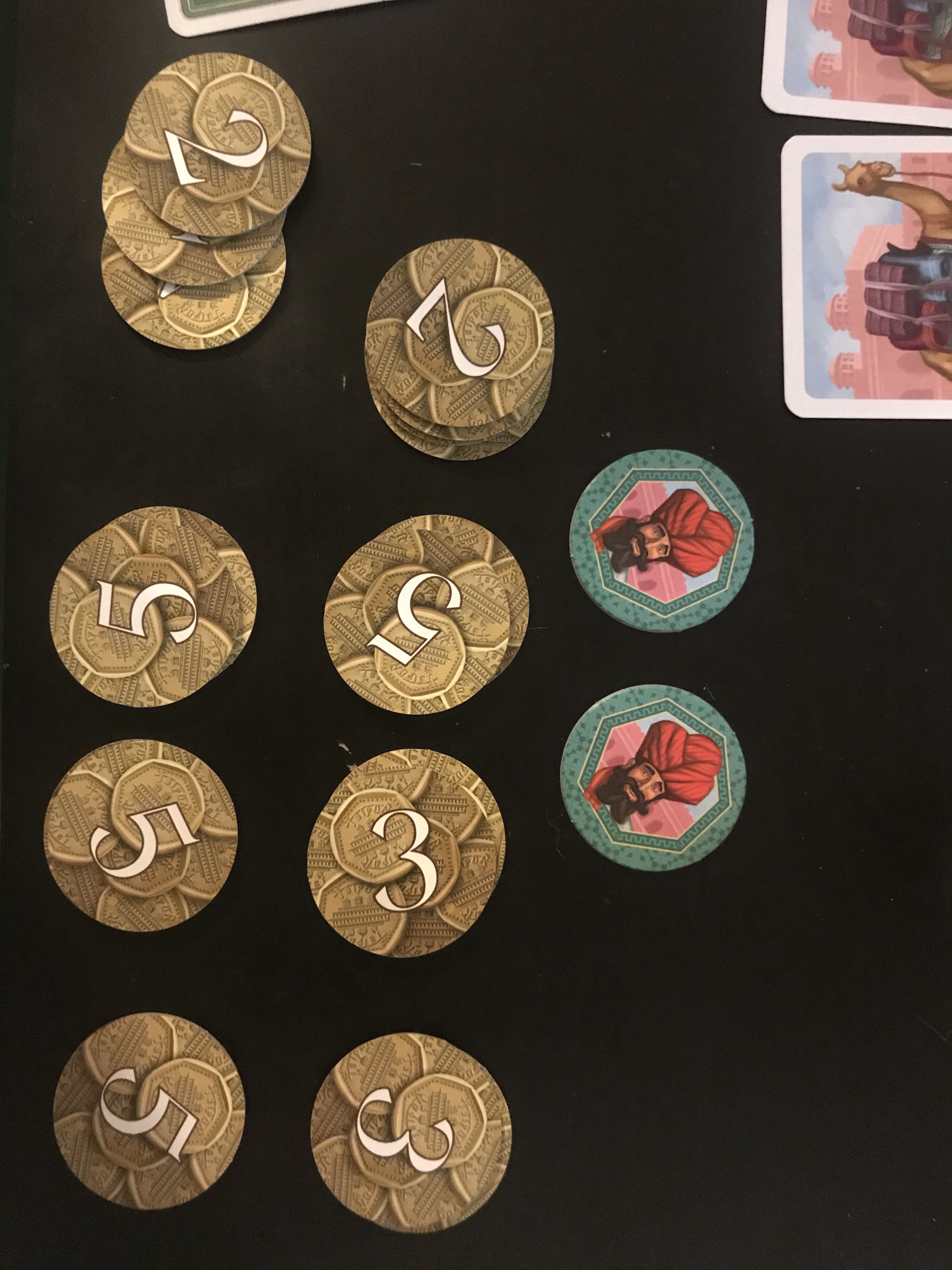 There are also camel cards, which are great to collect just so that you can trade them for resources. (They don’t count as a part of your hand, so you can collect as many as you want!) If you happen to have the most camels at the end of the round, you get a bonus of 5 coins—but I wouldn’t bet on that as your primary strategy.