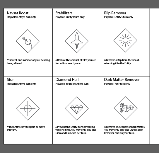 The Ship uses energy to change its heading and move along the hex grid. It also can acquire Tech Cards to help it combat the Entity. I kept it simple and included only six types of Tech Cards for the sake of the prototype.