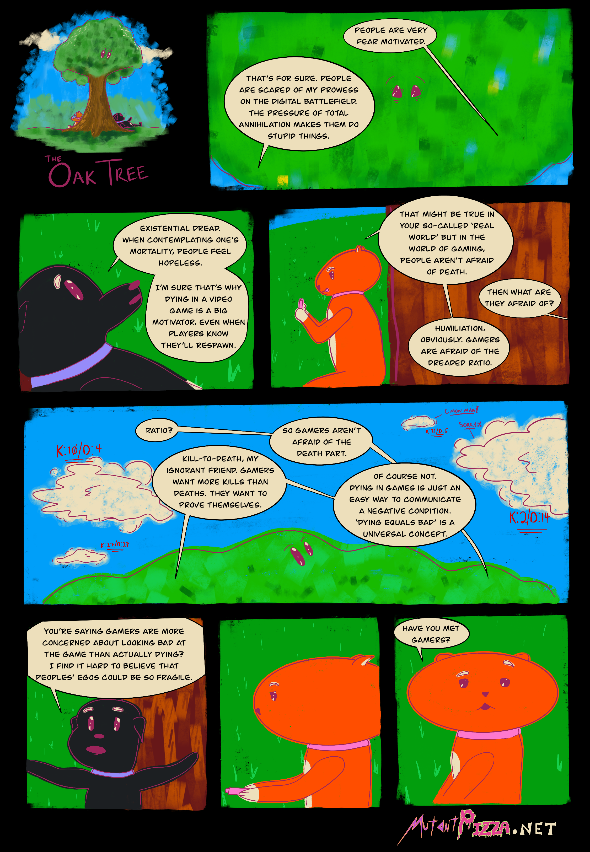 The kill/death ratios of the clouds in the sky are somehow visible, not unlike a video game HUD or information screen. The Oak Tree silently judges a cloud with a poor ratio. A cloud with an impressive ratio shouts “C’mon man!” to which the unskilled cloud can only reply “Sorry :(” for their lackluster performance.