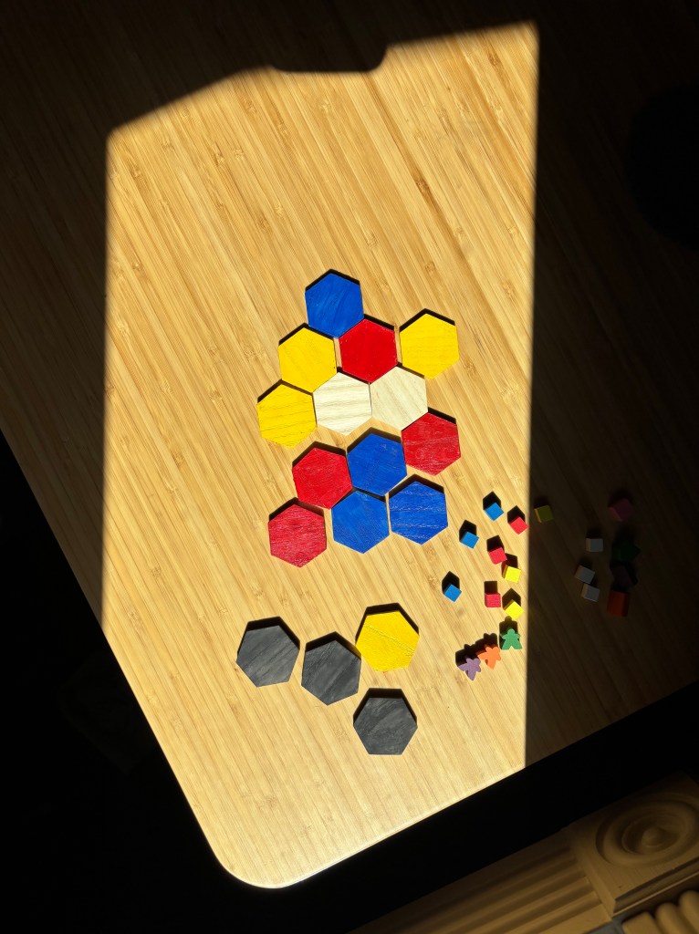 Overall, I’m thrilled with how Color Space plays now. The whole game will come in a bag and consists of tiles, cubes, meeple, and some cute lil houses. I may change this up slightly if I find something better to represent the Primary player other than a 10mm pink cube, or maybe not — we’ll see!