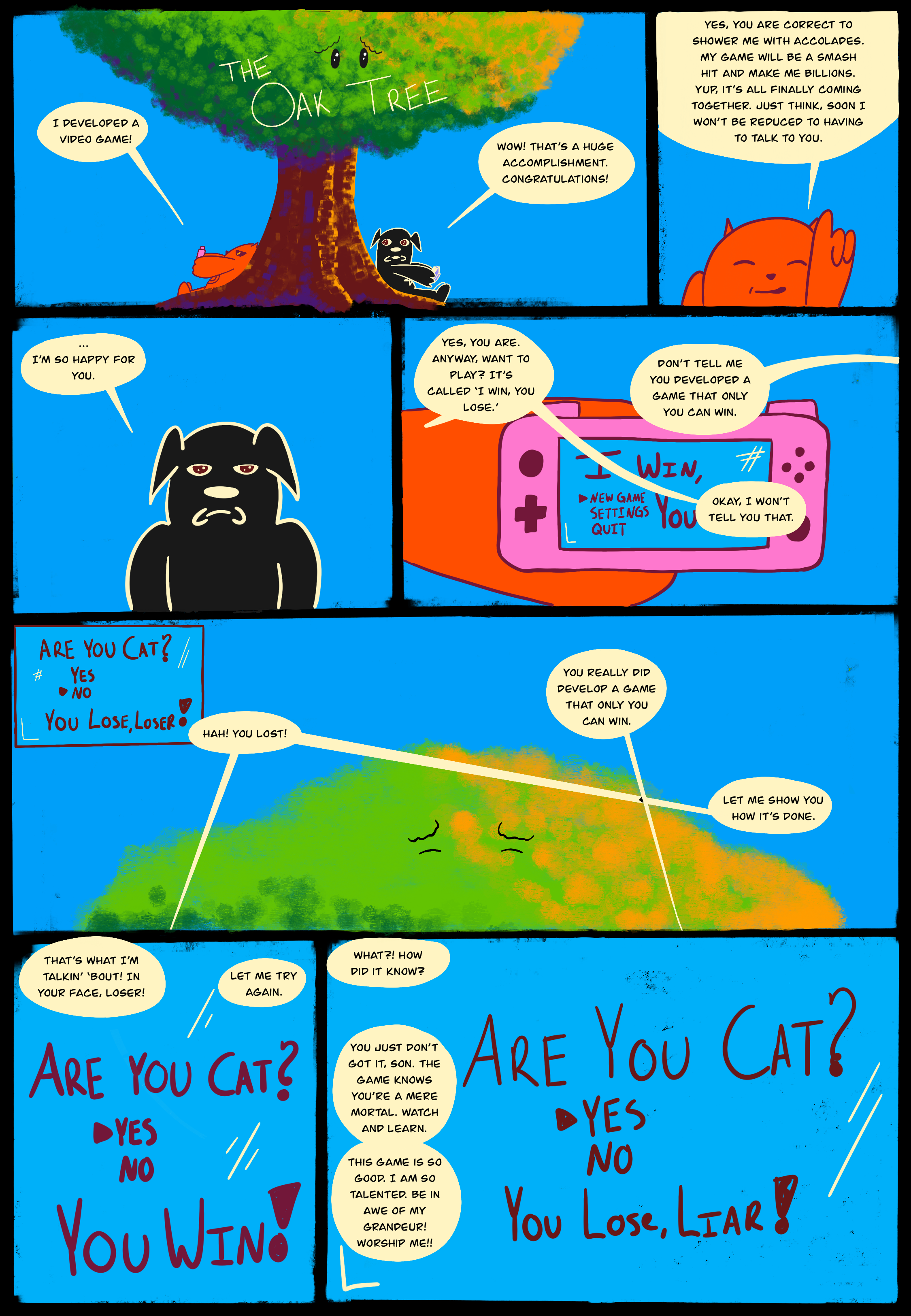 Cat holds out their console for Dog to take, its screen displaying the game menu for “I Win, You Lose.”