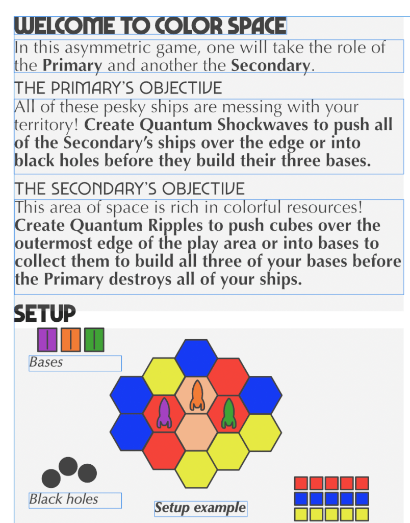 Color Space is going to include a folded up, double-sided sheet of paper that explains the game. I’ve been working with other designers, having them perform certain actions of the game like setting it up solely by reading the steps from the document, or having them read through and teach me how to play the game.