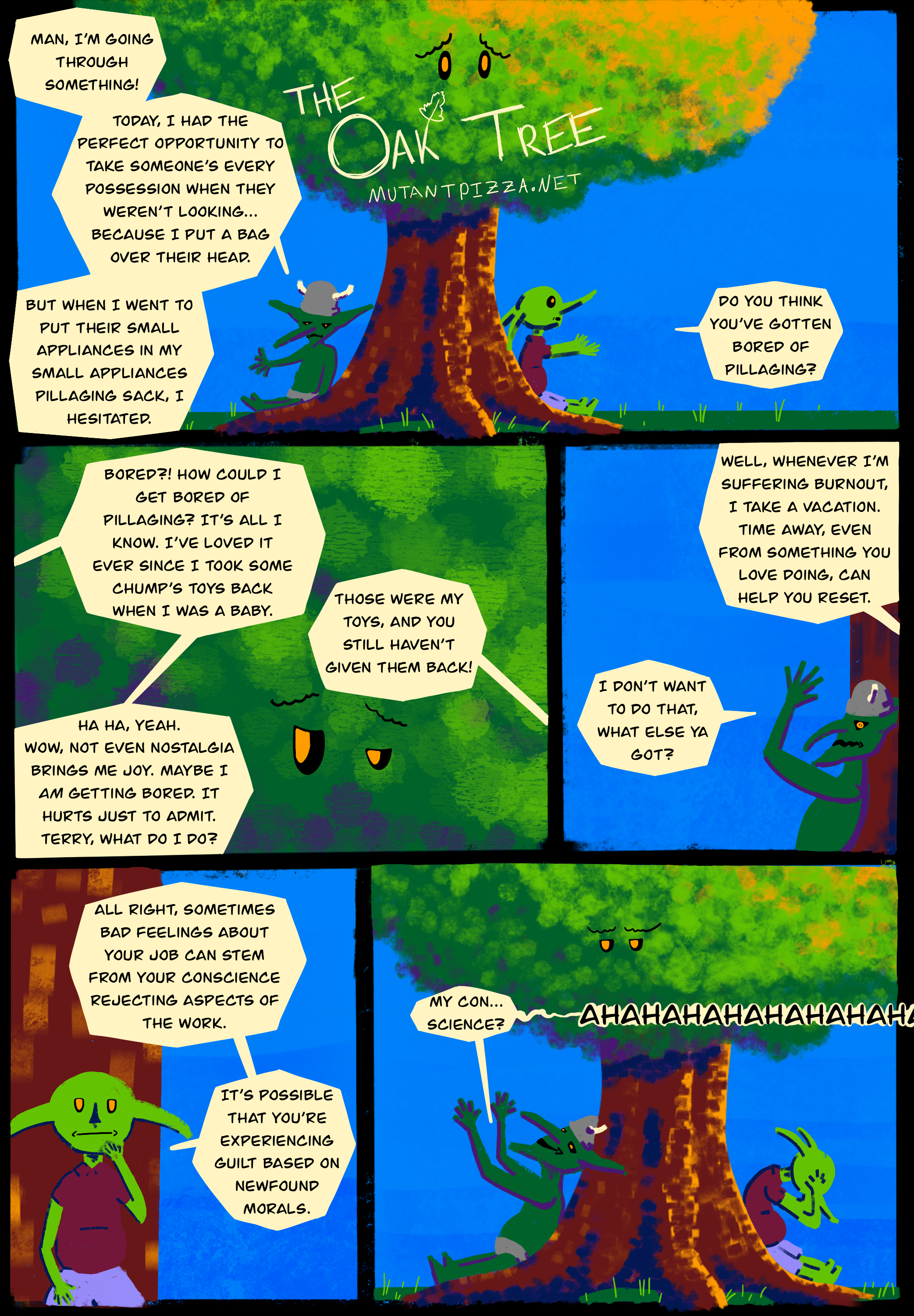 The tree silently judges this conversation with its silent, judgey eyes. (Yes, the tree has eyes in this webcomic. No mouth, though.)