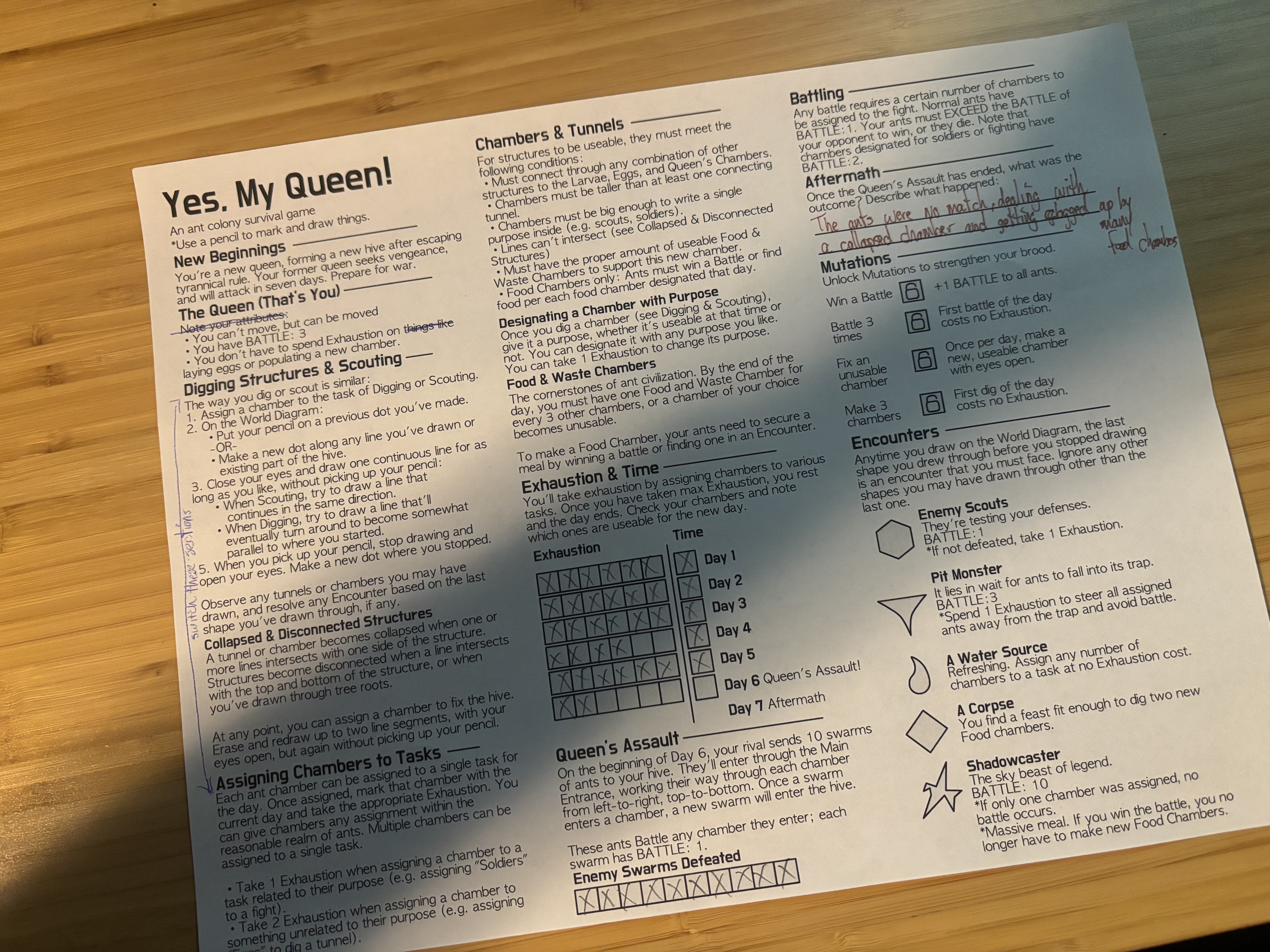Yes, My Queen! is a one-page one-player one-hive one-mind sort of game. It’s common to think of these sort of one-page games as RPGs but it’s not really an RPG, so I’m trying to stay away from that taxonomy. You play as a newly cristened queen ant, post nuptial flight, settling down in your own, brand new hive. Your former queen takes your departure personally, vowing—as much as an ant can make a vow—to send an army to your doorstep within six days. You must prepare for war.
