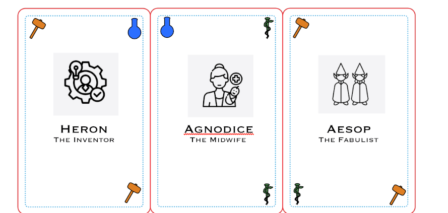 On your turn, you’ll place one of these philosopher cards in front of you to add to your study group